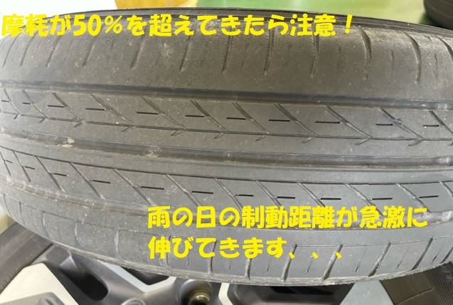 特に、新品時から50%くらい摩耗すると、雨の日の制動距離が急激に伸びてきます(>_<)