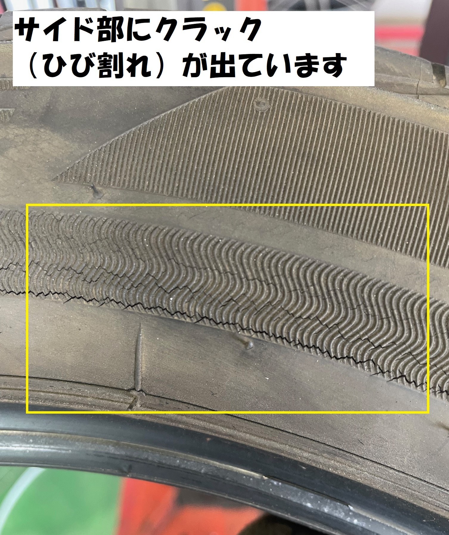 タイヤの残りミゾの有無も重要ですが、ひび割れはゴムの劣化の合図。
