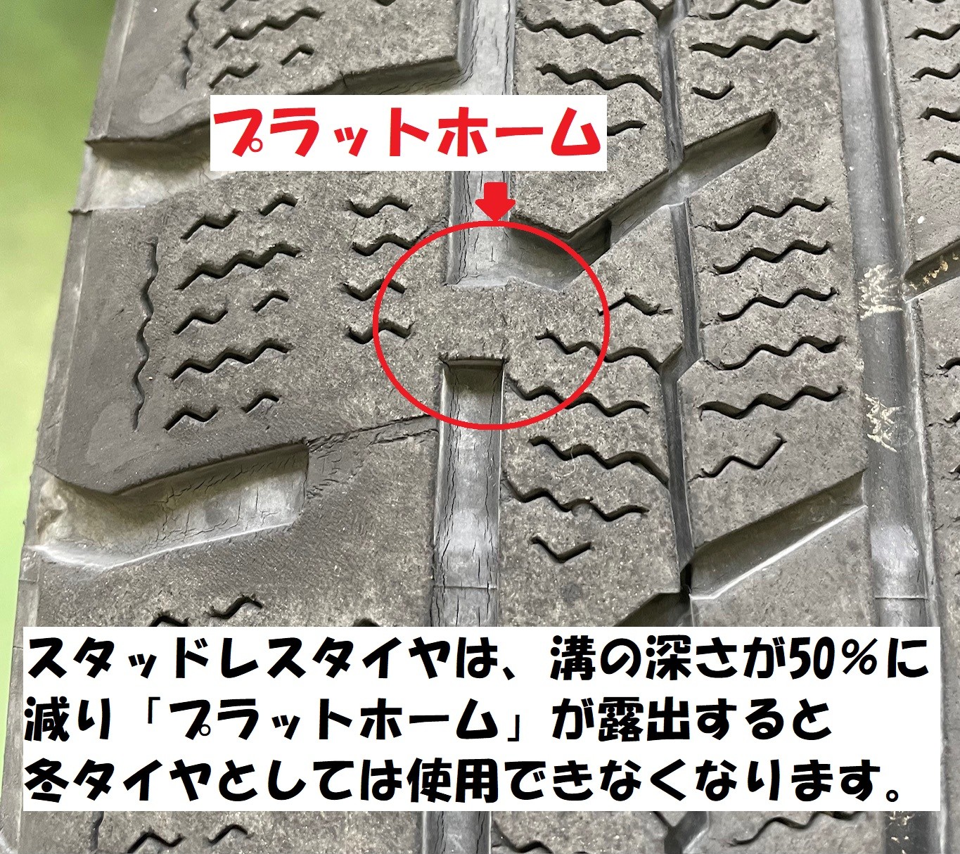 プラットホームはスタッドレスタイヤが氷上性能を維持できる「新品時より残溝50%」になると、上の写真のように露出されます。