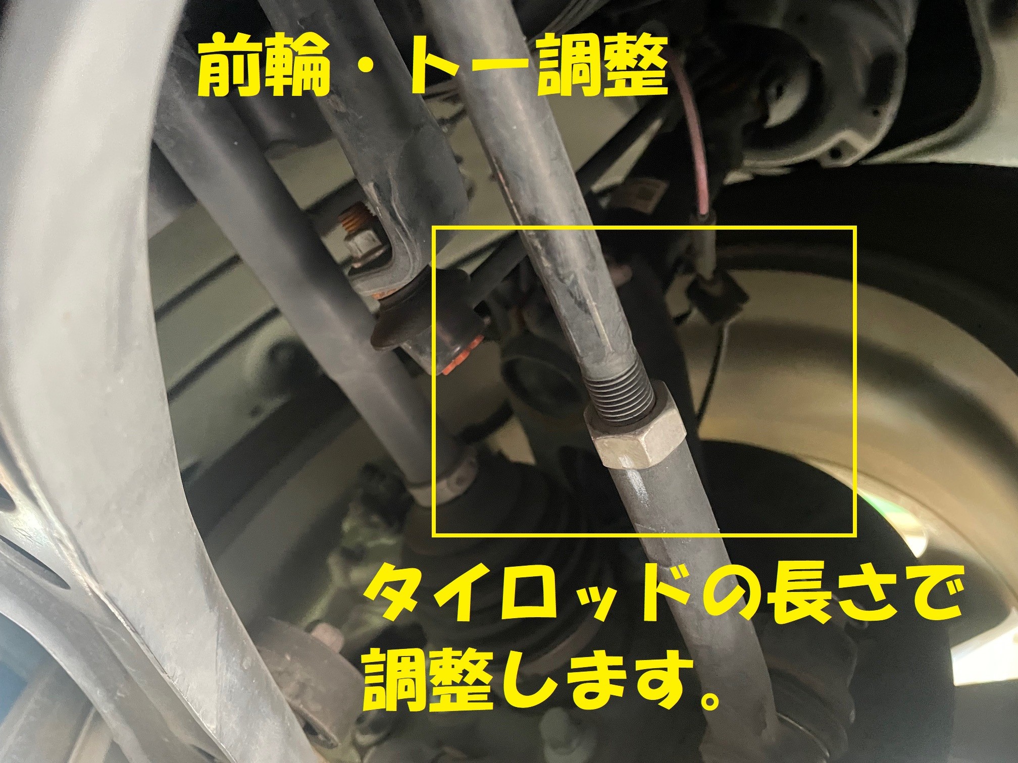 タイヤと車体を繋いでいる「タイロッド」を回転させることにより長さが変わり、トー角が調整していきます。