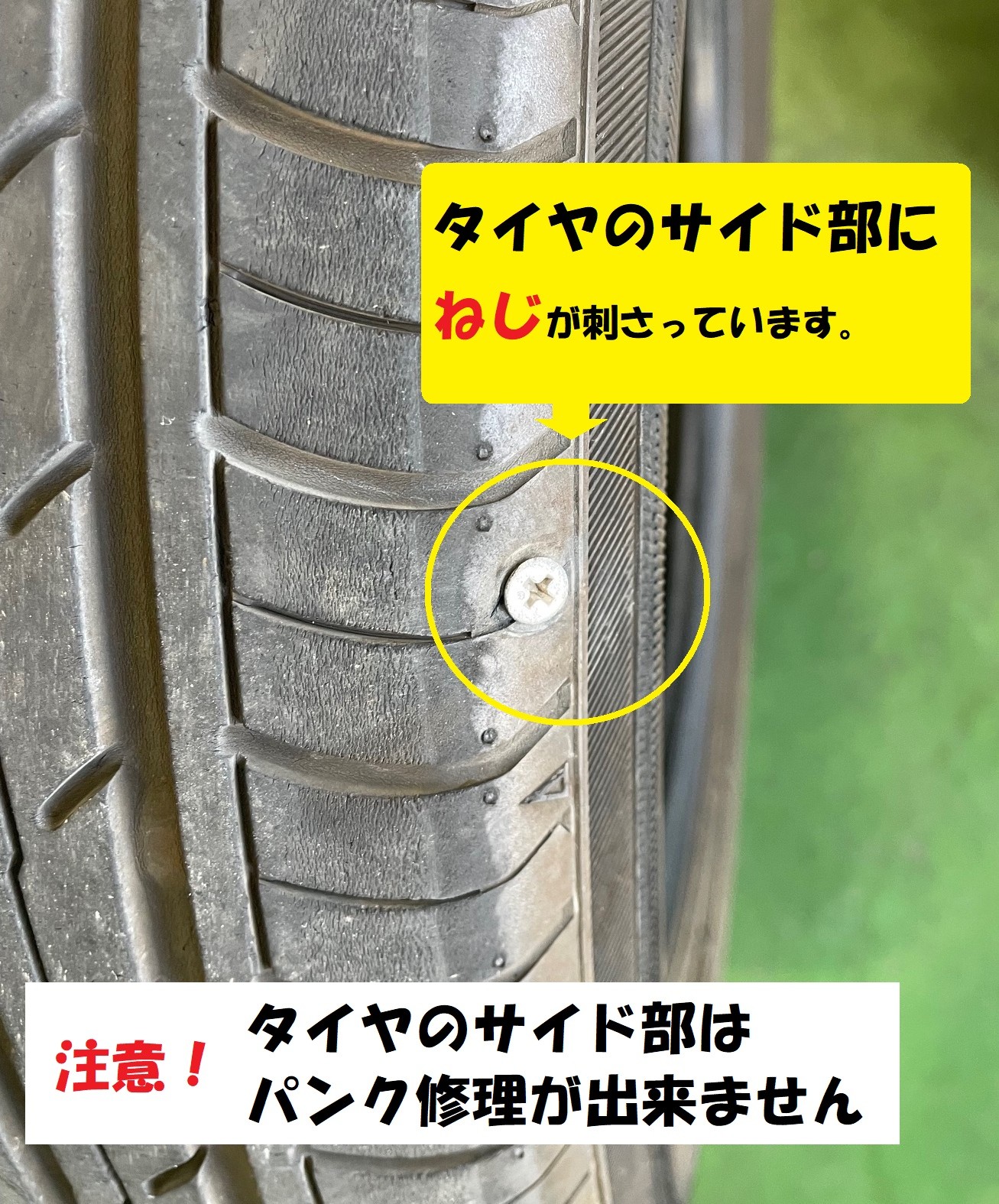 問題は刺さっていた場所が「タイヤのサイド部」でした、、