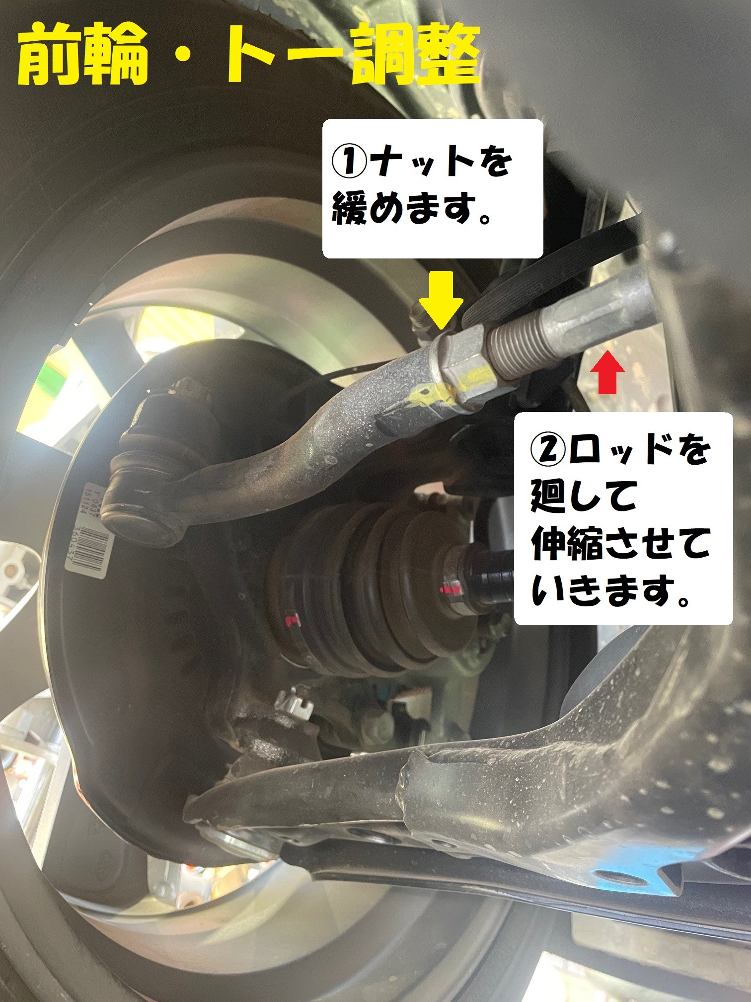 その後に調整となりますが、ナットを緩めるとロッドが回転するようになり、伸ばしたり縮めたりしてトーの数値を規定値&左右均等に合わせます。