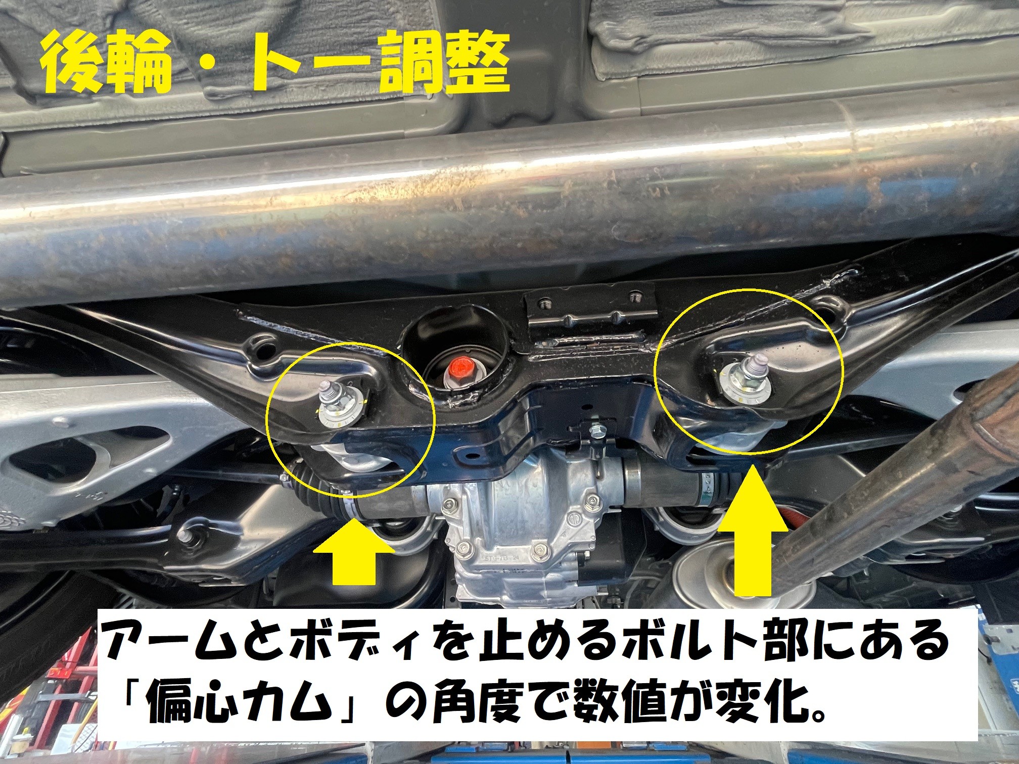 後輪のトー角調整は、タイヤの路面接地状態を改善させる事と共に、車の進行方向を定めるにあたり重要な数値。