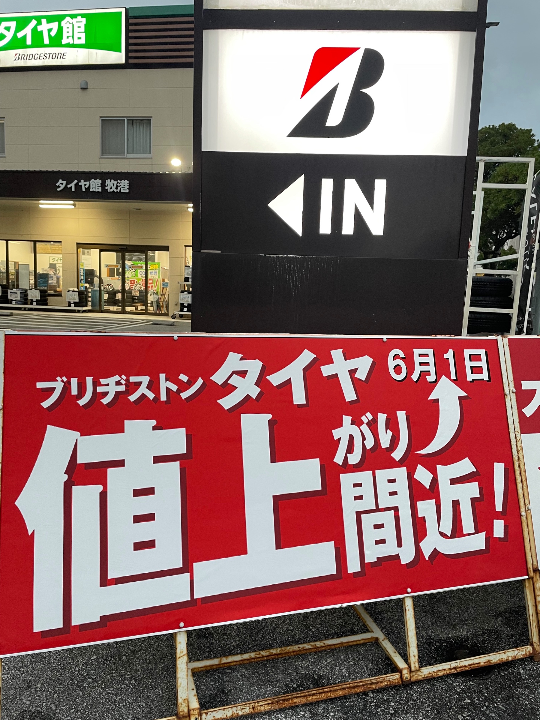 ブリヂストンタイヤ 6月値上がります ポスト 2025年3月31日 ブリヂストンタイヤが6月1日から約8%値上がりします。 5月には、注文が殺到するはずです。 全国的に欠品になります。 納期が5月中に間に合わない場合は、申し訳ありませんが、5月にご注文頂いても、6月以降の納品分に関しましては、値上げ後の料金になってしまいます。 是非早めにご検討ください。 タイヤ館 牧港 住所:901-2131沖縄県浦添市牧港1-60-9 電話番号: 098-943-5611
