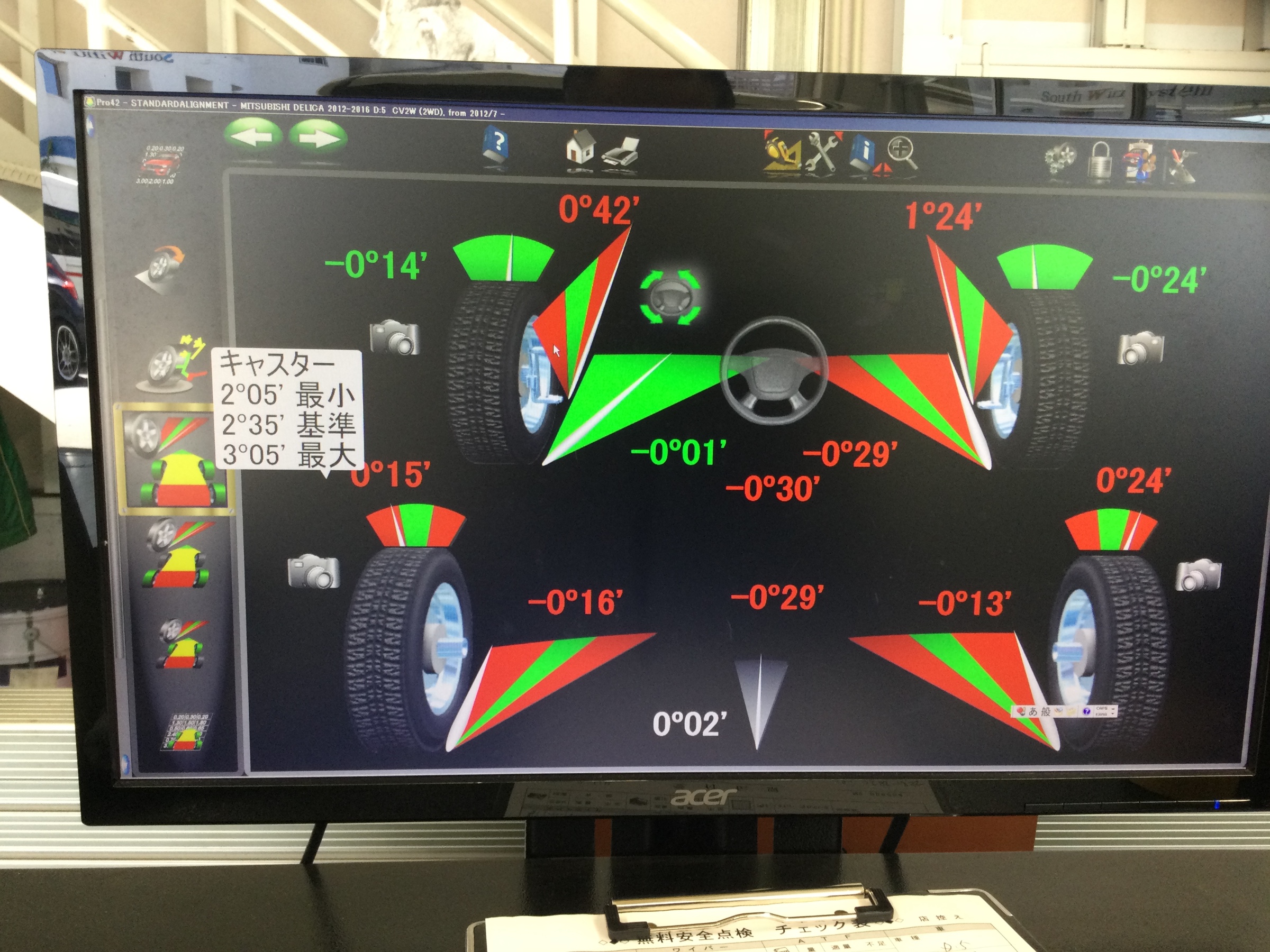 デリカアライメント調整٩(๑❛ᴗ❛๑)۶ ポスト 2025年4月14日 ショック交換後からステアリングのセンターがズレているとの事で、アライメント調整させて頂きました。 4ヶ所調整させて頂きました☆ アライメントの事なら実績多数あるタイヤ館牧港にお任せ下さい。 タイヤ館 牧港 住所:901-2131沖縄県浦添市牧港1-60-9 電話番号: 098-943-5611
