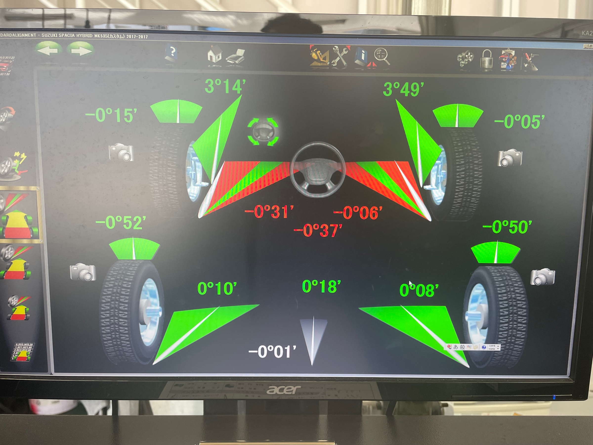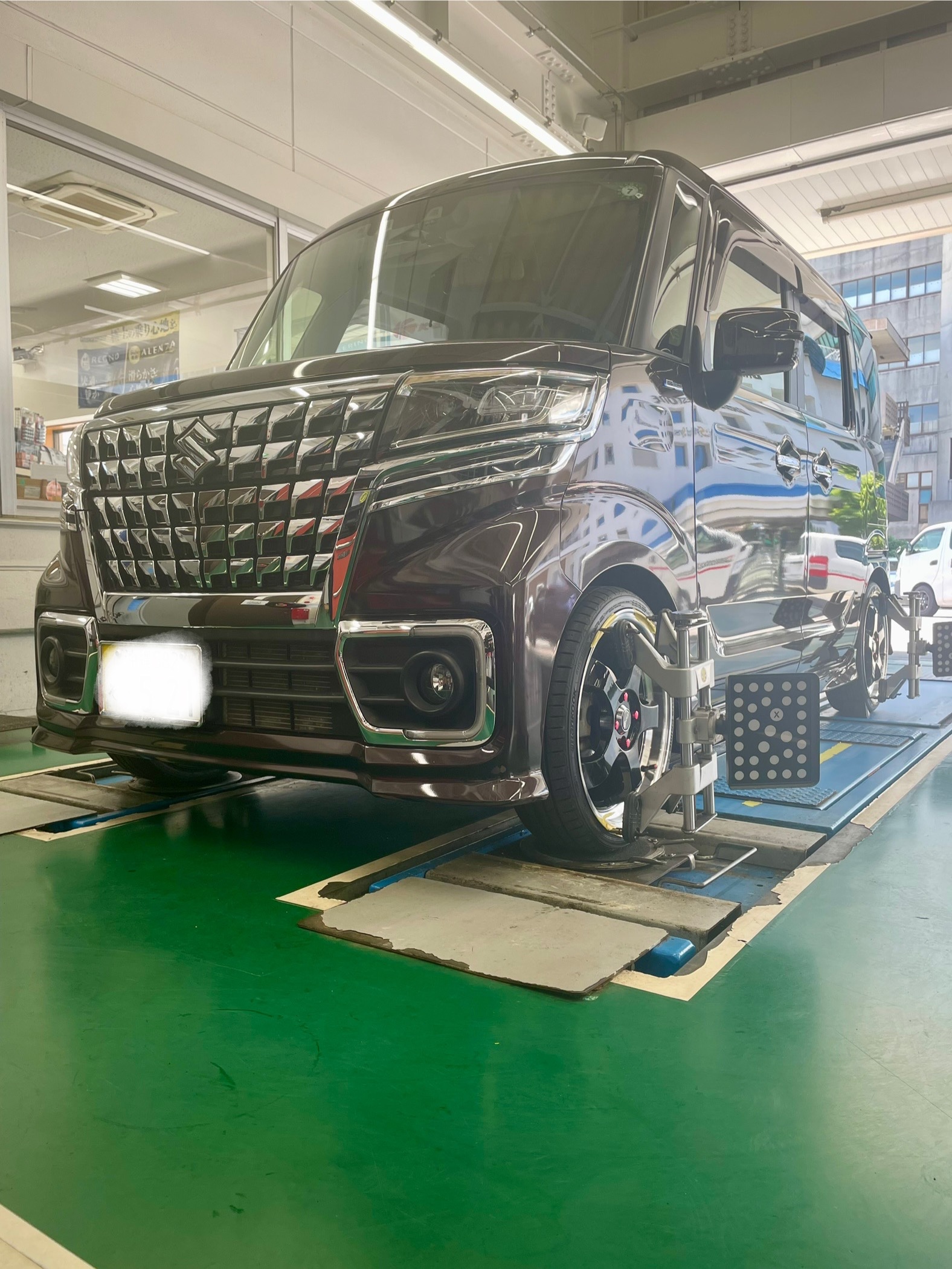 スペーシアカスタム アライメント調整♪(๑ᴖ◡ᴖ๑)♪ ポスト 2025年5月8日 今回ご紹介する車は スペーシアカスタム お車を購入時からダウンサスが装着されており ハンドルに違和感があるので測定しました。 タイヤが開いた状態です。 特に左前が開いています。 バッチリ調整させて頂きました☆ タイヤ館 牧港 住所:901-2131沖縄県浦添市牧港1-60-9 電話番号: 098-943-5611