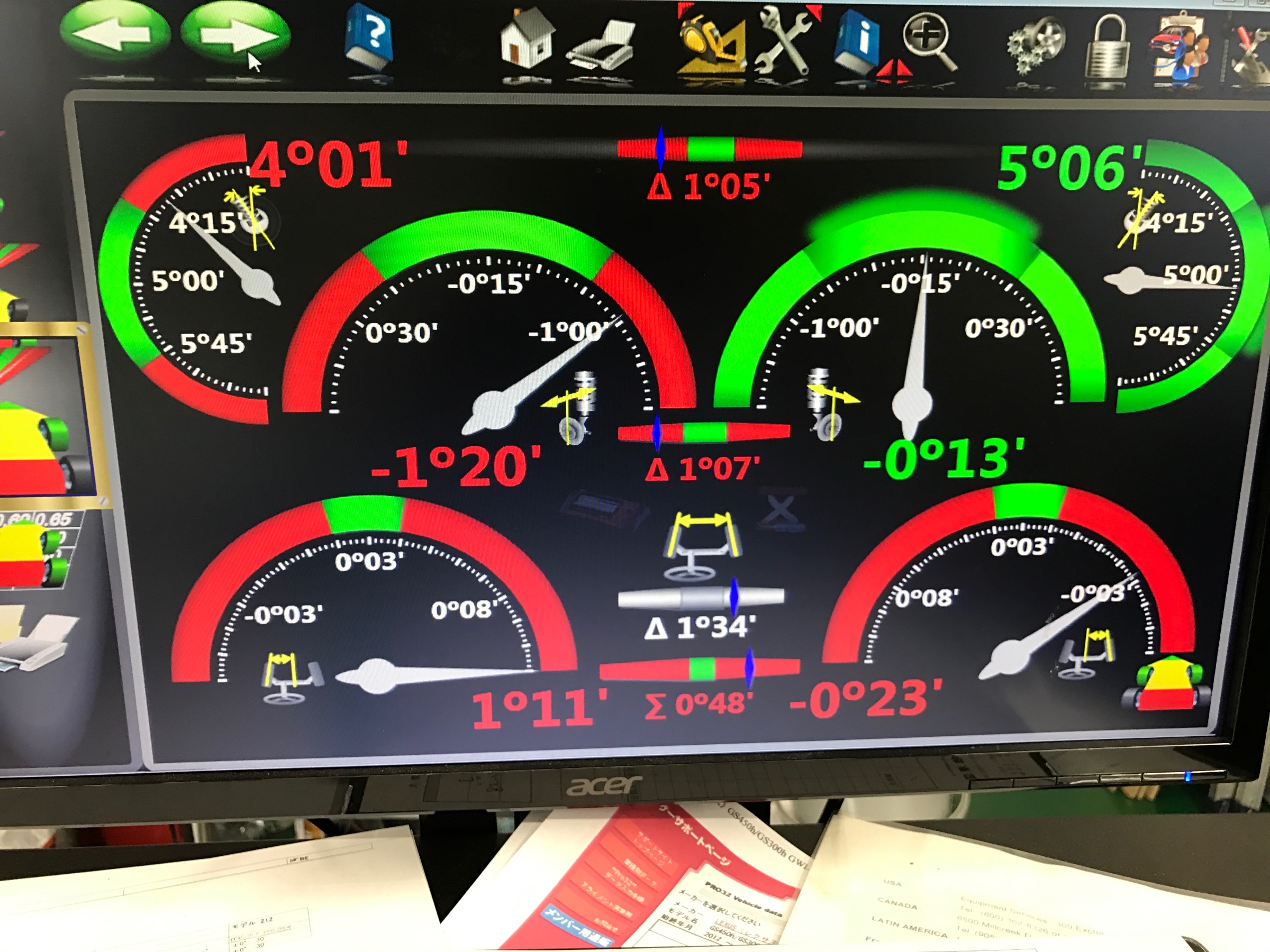 ハンドルをまっすぐにした状態で、左前が右に1度11分向いています。