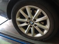 お車はまだ5000kmしか走っていないのに、 残念ながらパンクをしました! もし、タイヤのパンクを気付いたら、すぐロードサービスをお呼びください! 空気圧が少ない状態で走ると、タイヤがだめになりますよ。 貼りウェイトとアルミホイールもキレイにしました!