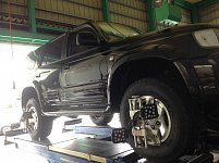 サーフのアライメント調整作業です。 リフトアップ(車高UP)してからアライメント調整をしていなく、 ハンドルを左に切っていないと真っ直ぐ走らない とのことでした。 写真はフロントの調整前のハンドルを真っ直ぐにした時のデーターです。 目盛が振り切ってしまっています。。 我慢して長い間乗...