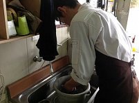 作業の合間に浪川スタッフがお洗濯をしています! スタッフがユニフォームの上に装着するアームカバーを、 気合の手洗いでキレイに洗っています!