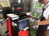 アライメント(タイヤの取り付け角度)の 測定の様子です。 走行距離が伸びるにしたがって、あるいは 縁石、輪留めなどへの接触によって アライメントにはずれが生じます。 タイヤ交換の際に併せて実施して頂くと 偏摩耗を抑制しタイヤを長持ちさせることが できます。 タイヤ交換の際には、ぜひ!