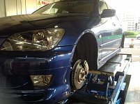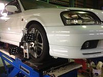 車高調を取り付けた後のアライメント調整です。 車高を下げたことにより、アライメントの数値がずれますので、 足回りを作業した場合はアライメント調整は必須です。 また、足回りを交換していない車でも年数、距離がすすむとサスペンションがへたって 車高が下がってきます。 一度、お試しください。