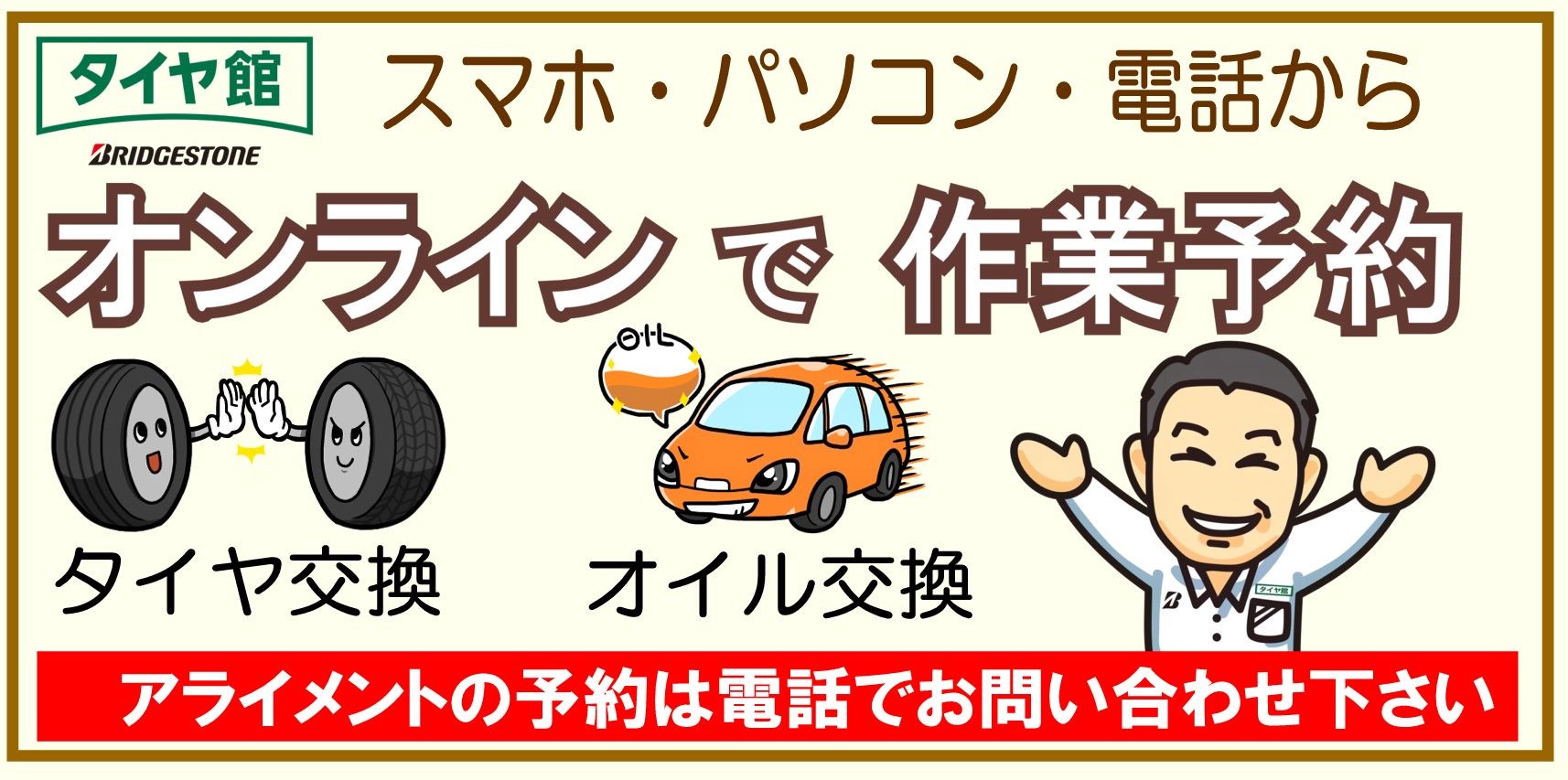 タイヤ交換、オイル交換などは作業予約で待ち時間短縮、確実に予定が立ちます。