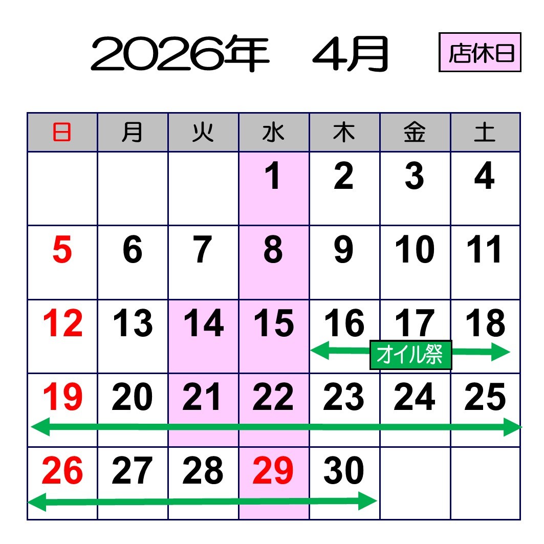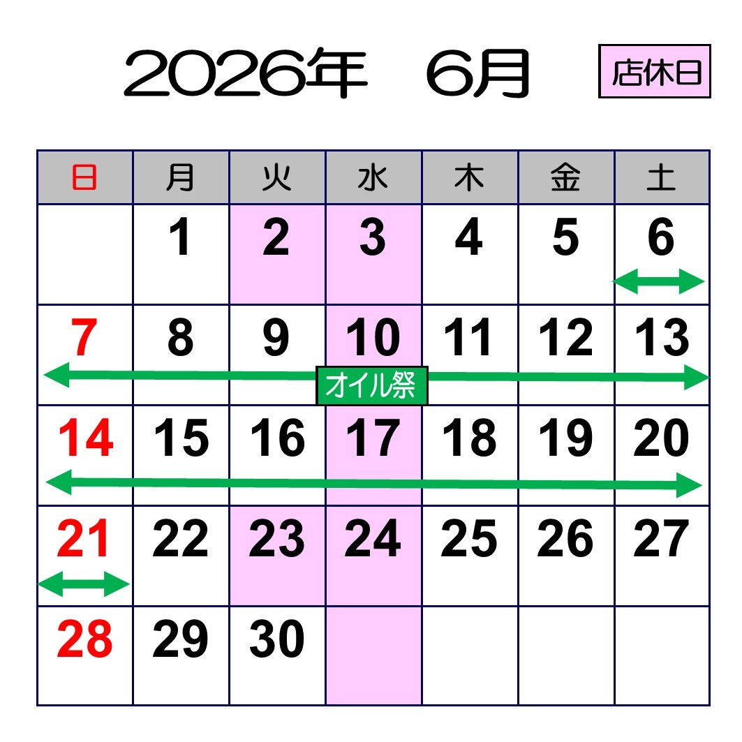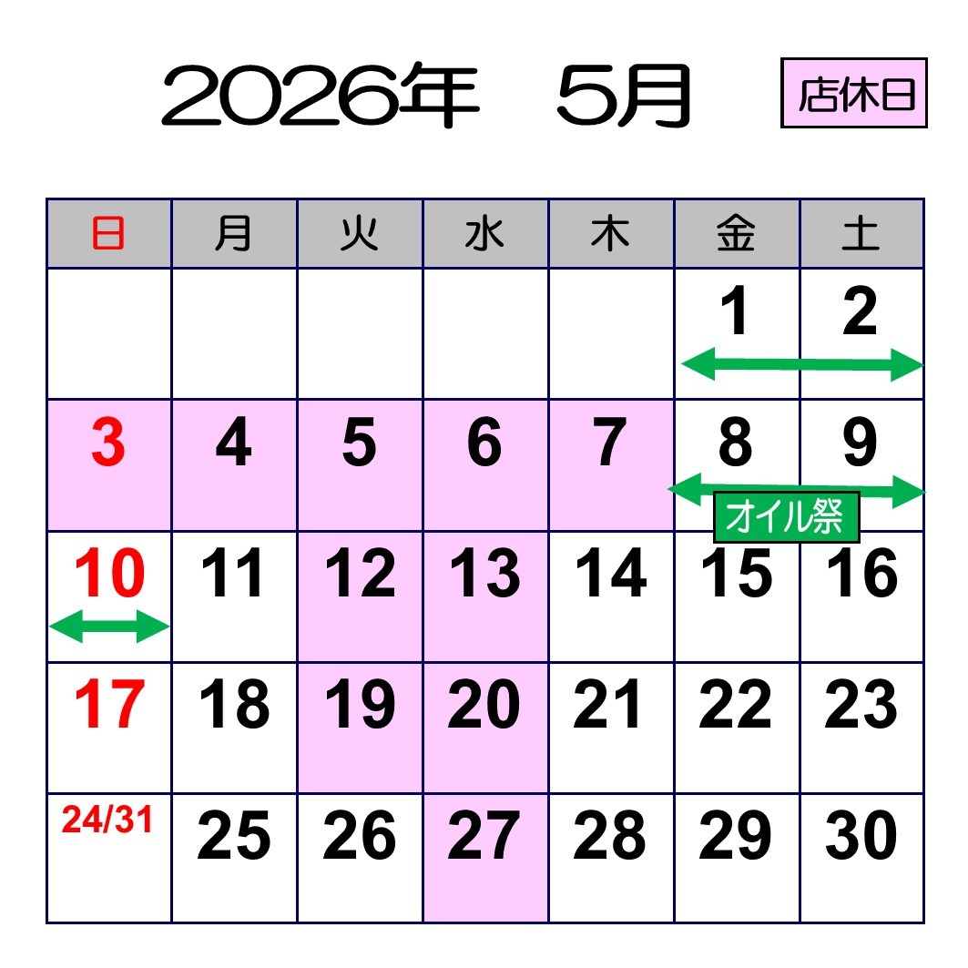 タイヤ館真庭 営業カレンダー(オイル祭り日程入り)
