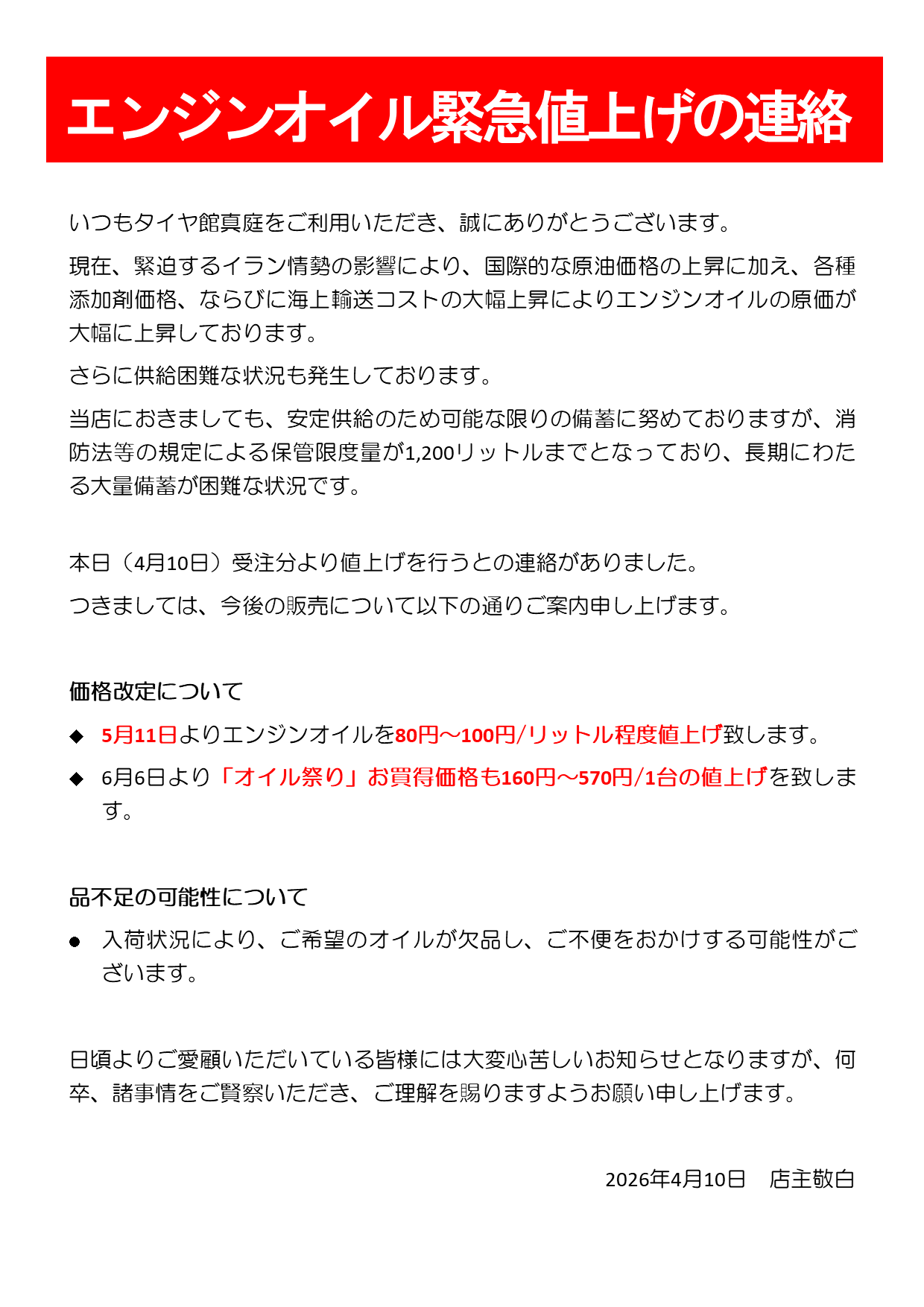 本日(4月10日)、卸先より「本日受注分より値上げを行う」との連絡がありました。