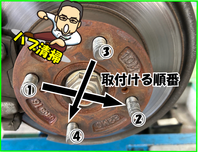 ハブ面の錆を落として番号の順で取り付けていきます。