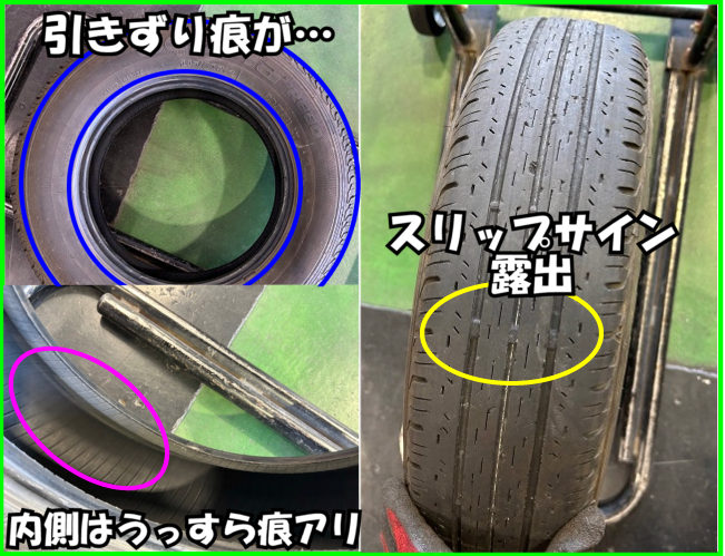 内部を損傷している恐れがあるためタイヤをホイールから外して内側も見たところ、うっすら痕がありました。お客様に状況を説明しスリップサインも露出している事から新品の交換となりました!
