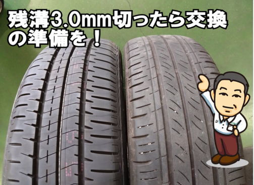 今すぐの車検なら通る溝深さ(1.6mm以上)ですが、雨の日のブレーキ性能は3.0mmを切ると極端に制動距離が長くなって危険ですよ。