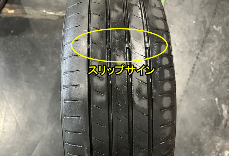 スリップサインが露出したタイヤは雨天時のブレーキ性能が落ちますので