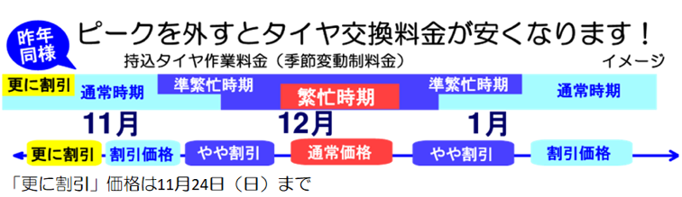 一方、それを外すと割引き料金でタイヤ交換が出来ます。11月初旬から下旬に掛けて割引き料金です。(土日は通常価格になることもあります)