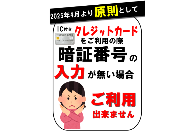 JCCA(日本クレジットカード協会)の方針により、2025年4月以降、店頭でのクレジットカード利用時の本人確認方法は、原則として暗唱番号の入力が必須となります。サインなどによる本人確認はできなくなります。