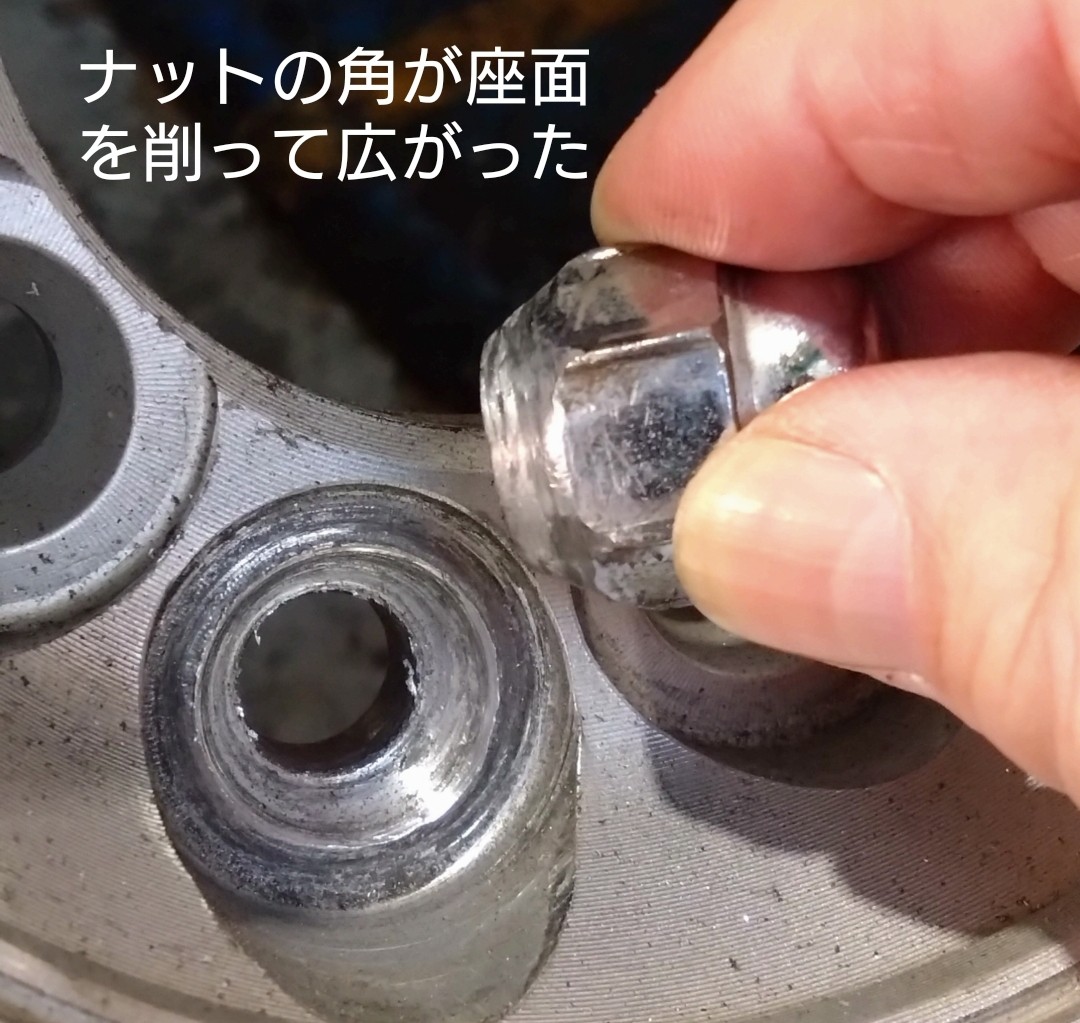 ナットで取り付けてあるアルミホイールのナットホールです。アルミが削れて傷だらけの上に穴が広がってキチっとした60度テーパーの形状をしていません。