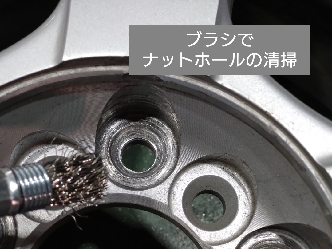 今回、ホイールの交換はなさらないということで、ナットホールを回転式ワイヤーブラシでナットの当たり面を清掃しておきます。