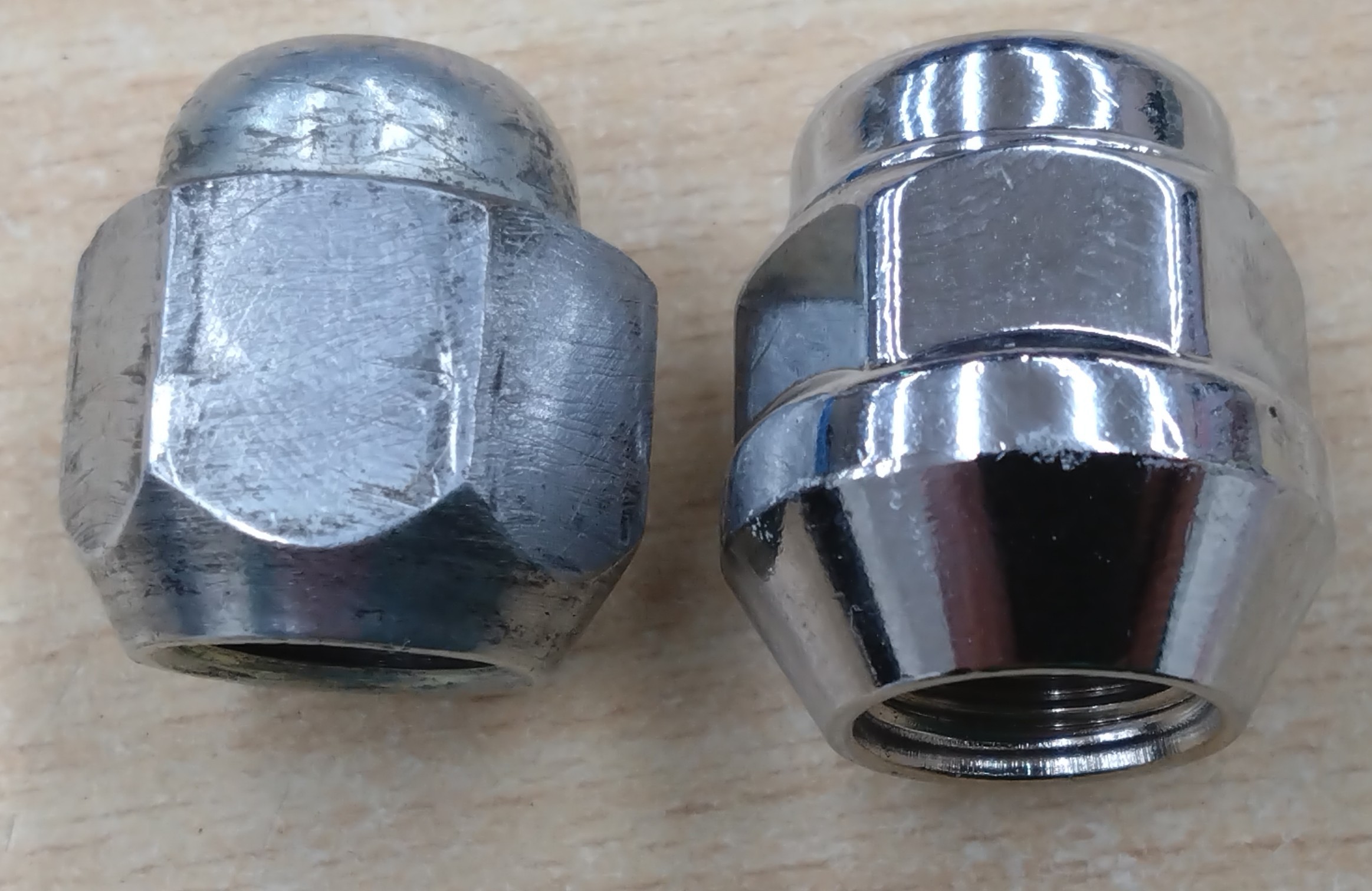 画像の通り、ツバ付きナットの当たり面は広く、六角の角がホイールを削らない形です。