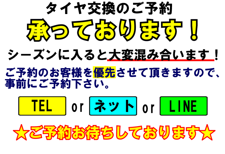 当日ご来店頂いてもすぐにタイヤ交換ができない場合がございますので、ご予約頂けると大変助かります。