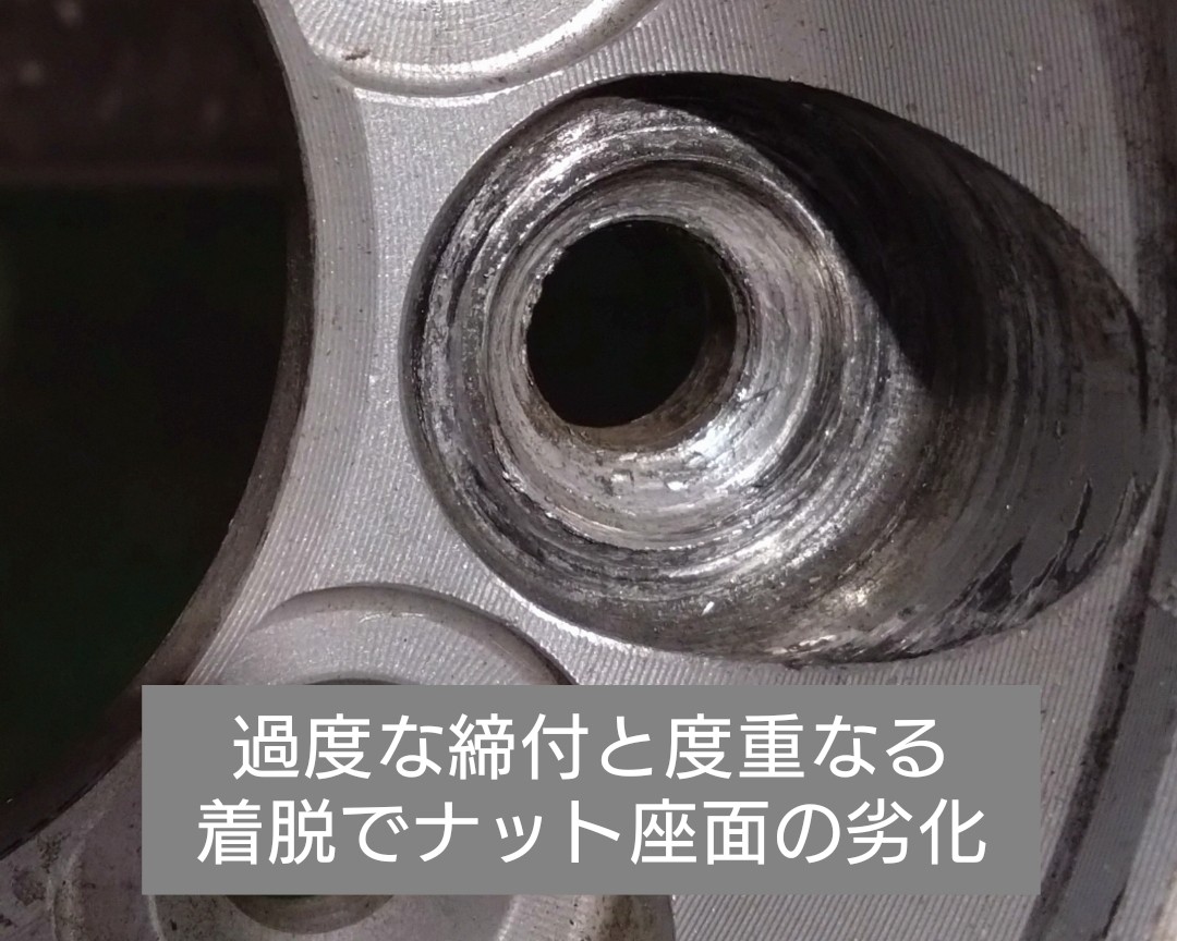 画像は長年使ってきたホイールのナットホールです。60度テーパー(すり鉢のような形状)の座面が広がり、つぶれているのが確認出来ます。