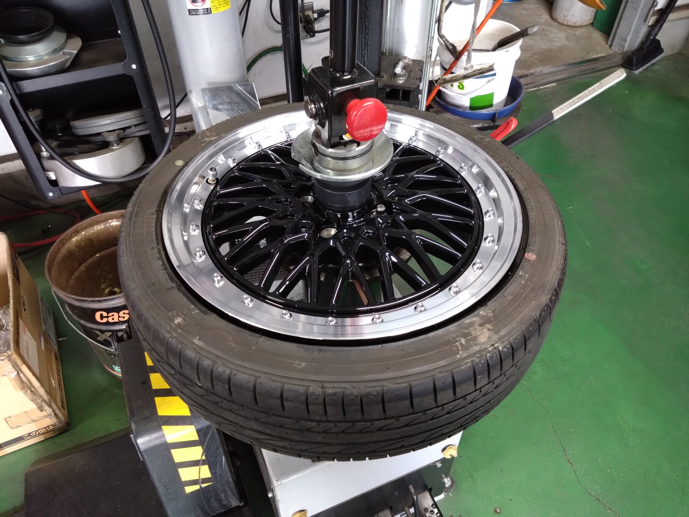 レバーレスタイヤチェンジャーでホイールとタイヤに優しいタイヤ組付けです。