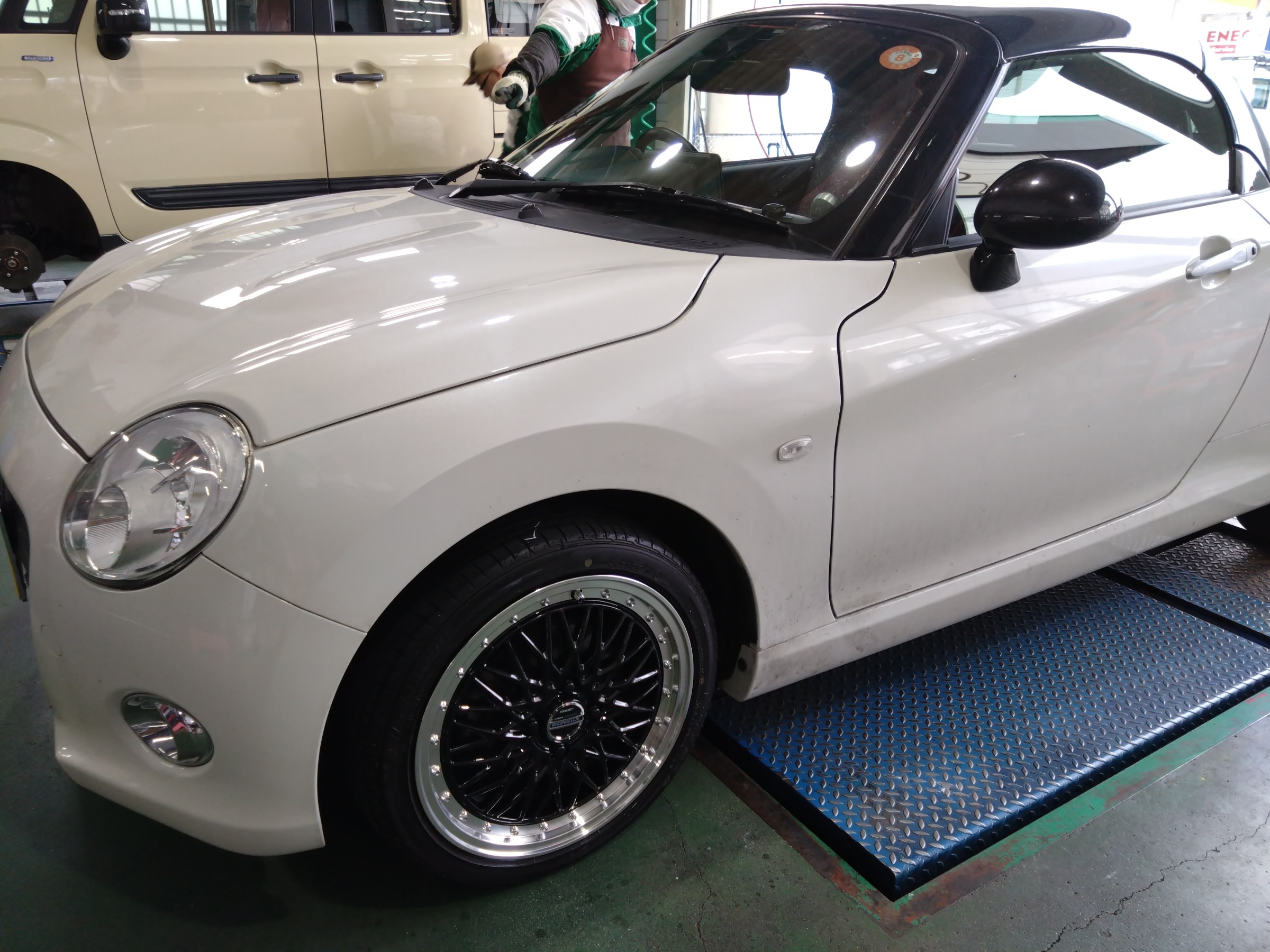 白いボディのダイハツ コペン、黒いディスクのホイールがスポーティでシャープです。リム切削がホイールを更に大きく見せてくれます。