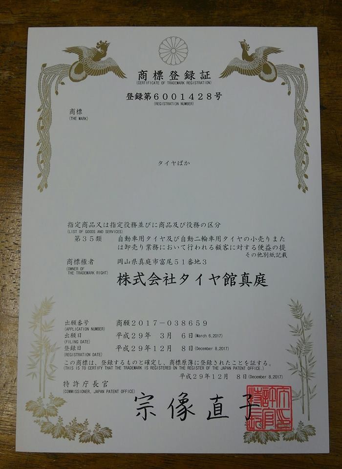 更なる「タイヤばか」に! ポスト 2017年12月21日 当社の経営理念はちゃんと買いとちゃんと取り付け。 そのどちらにも当てはまるのが「タイヤのプロフェショナル」。それが「タイヤばか」です。 2月頃から色々勉強して自分で申請し、特許庁に電話をし、「拒絶理由通知書」なるものを受け取ったり色々大変でしたがついに商標登録出来ました。 来年は「タイヤばか」を前面に押しだし、お客様の安全と安心のために更なるタイヤばかに成ります。 担当:小林利美