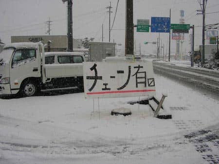 朝、出社して即席で作った「チェーン有ります。」の看板がスキー場に行く途中にあるような看板ですね・・・(´-ω-`;)ゞポリポリ