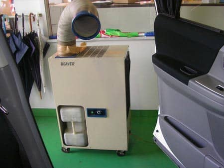 タイヤ館丸亀で内装作業をさせていただく場合は、スポットクーラーと扇風機ダブルで、汗を掻くことなく作業できる環境の下お客様のお車の作業をさせていただいております。