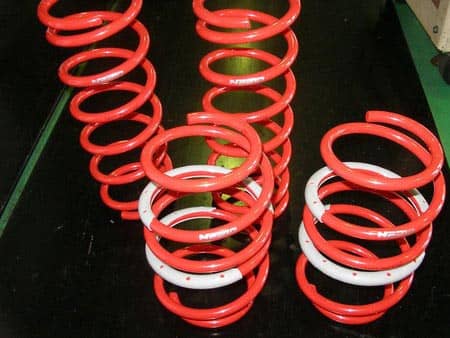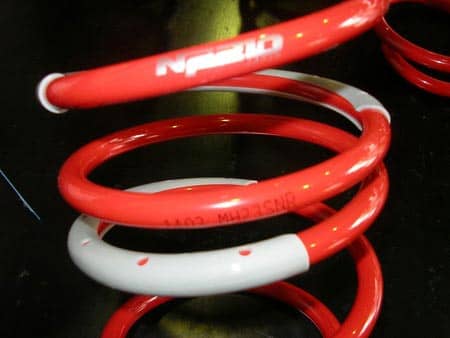 最近のダウンサスには、最初から写真のように、線間密着時に金属の擦れる音が出ないようにラバーが巻いてあります。