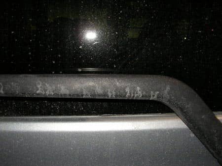 そう!凍結防止剤を散布された道路を走ってきたので、タイヤで巻き上げられた凍結防止剤が、びっしり車のボディーに付いてしまいました(´-ω-`;)ゞポリポリ