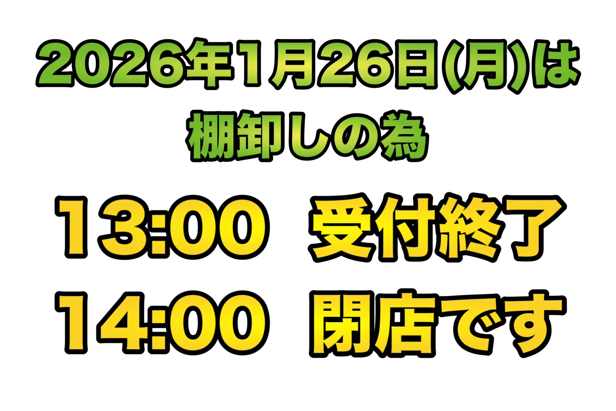 【営業時間変更のお知らせ】1/26(月)は棚卸しのため13:00受付終了、14:00閉店となります。