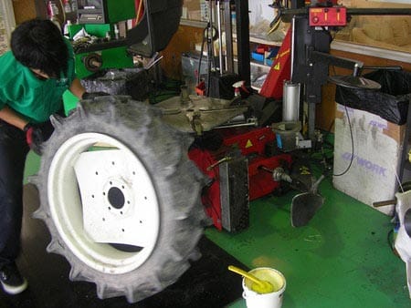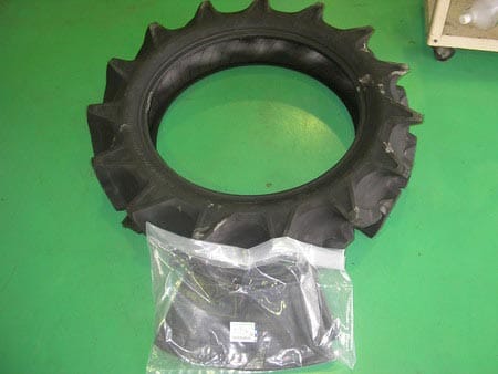 この作業は取引先の農機具屋さんからの作業ですが、トラクターについてるタイヤはこの写真のように大きなものから小さいものだと8インチとかのサイズもあります。