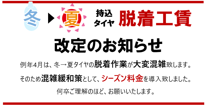 3月・5月中のノーマルタイヤ(夏タイヤ)への履き替え(ホイール付)がお得!早めの脱着で時間も短縮♪「ローシーズン料金」のご案内