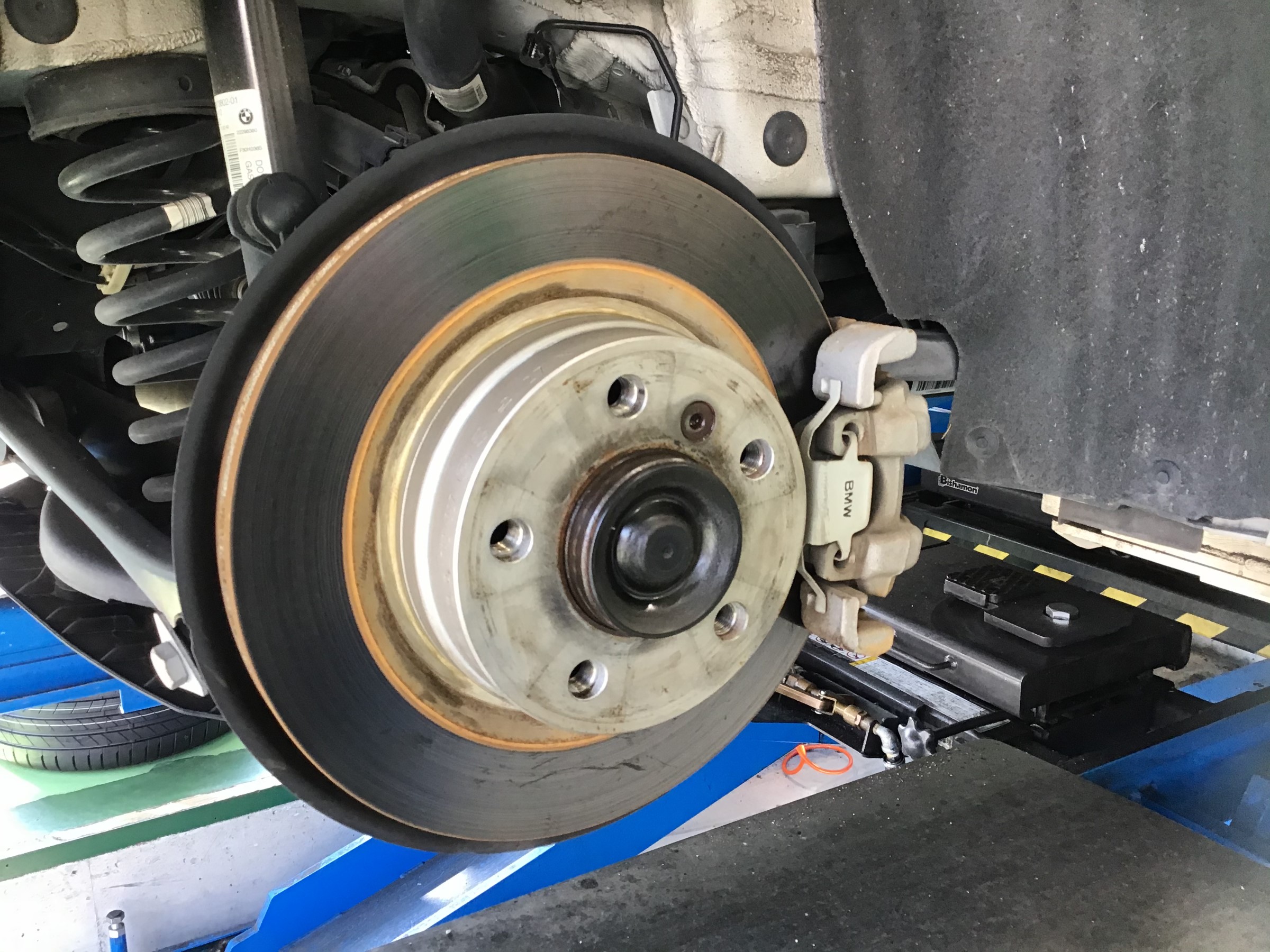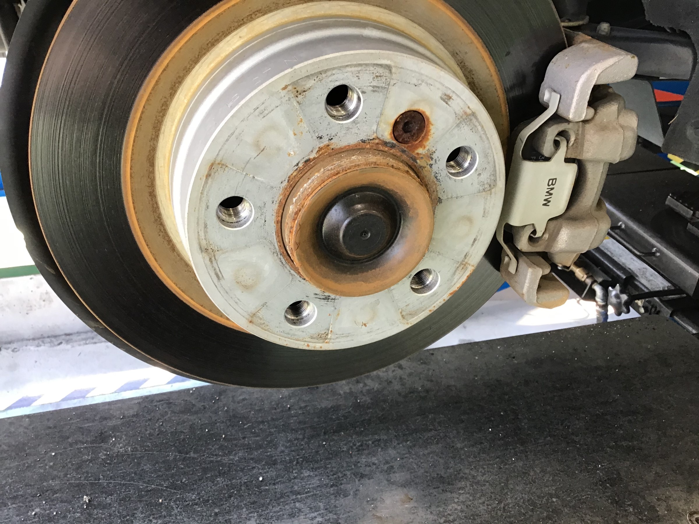 輸入車は真ん中の丸い部分、ハブがよくこのようにキツく錆びついています(-_-;)この状態ではハンドルのブレに繋がる事も…。我々スタッフとしてはホイールと固着してなかなかタイヤが取れなくて難儀しますね(>_<)