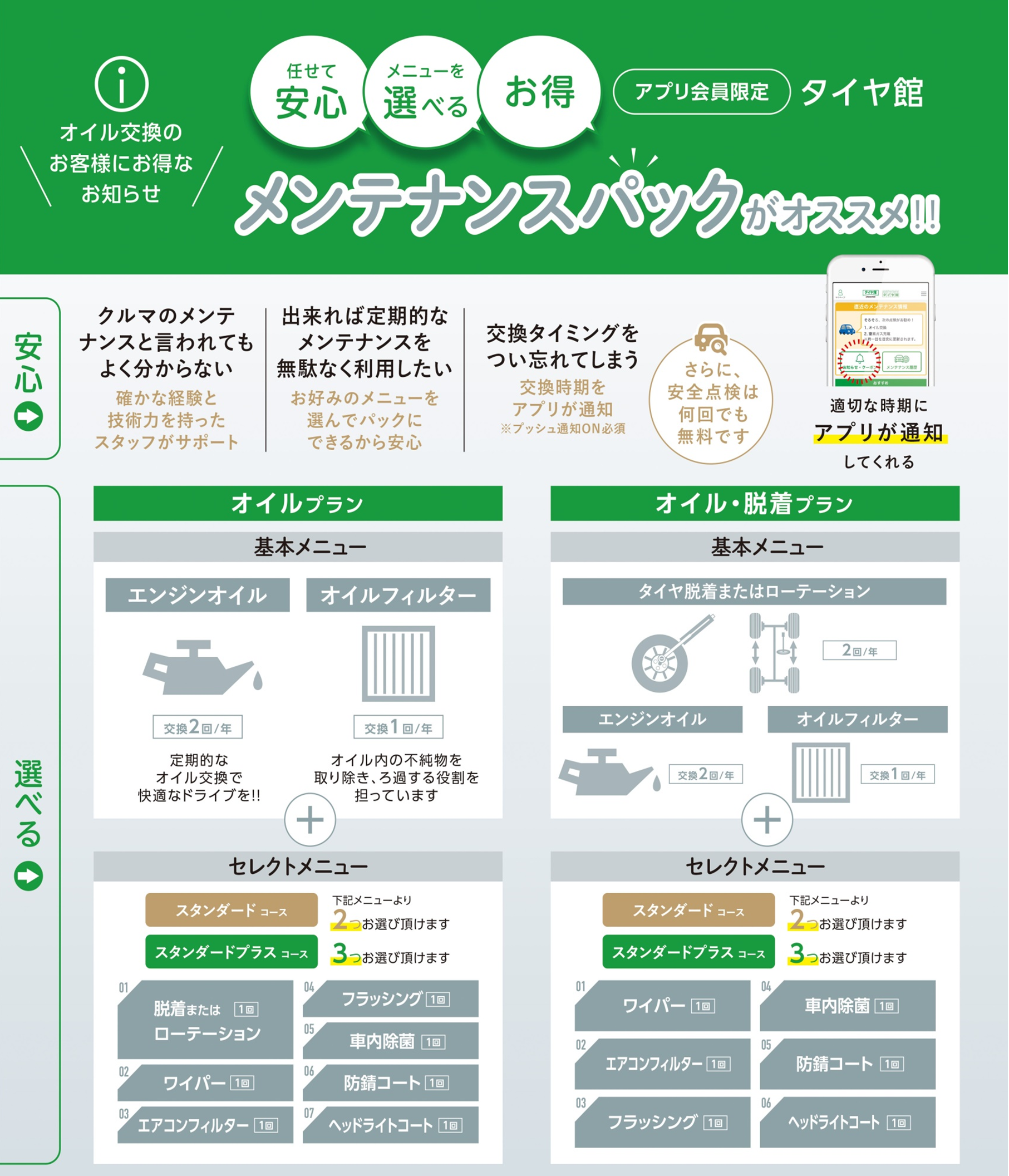 お得で便利な「メンテナンスパック」がスタートしました♪ ポスト 2021年2月1日 いつもタイヤ館 松原をご利用頂き誠にありがとうございます。 2/1日より、タイヤ館松原の新メニュー 『メンテナンスパック』が 始まりました!!! オイル交換2回+オイルエレメント交換1回に加え、 セレクトメニューから2種、もしくは3種お選びいただけます。 通常価格よりもお得で、お財布にやさしくなっています(*^^)v 「メンテナンスは決まったところでやってないな…」 「ずっとやってるけどもっとお得な所はないかな…」 と言う方は、是非お気軽にスタッフまでお問い合わせください! 車の事ならタイヤ館にお任せください(*'▽') カテゴリ:お知らせ