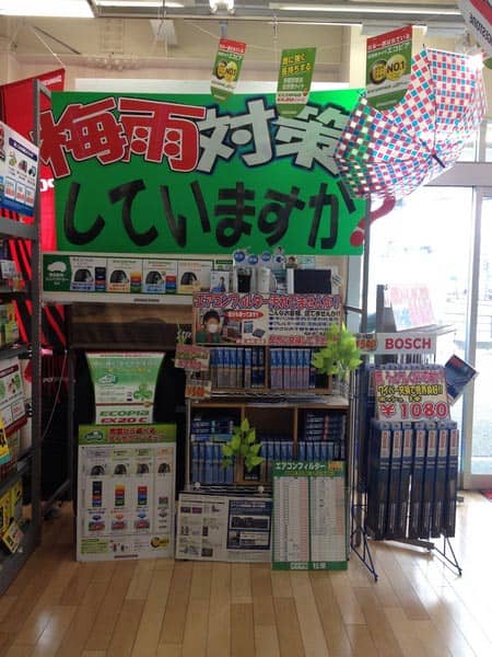 梅雨といえば、店内に『梅雨対策コーナー』を作成し、