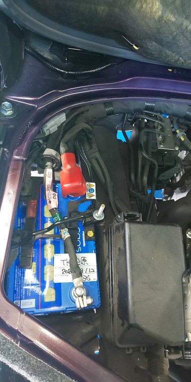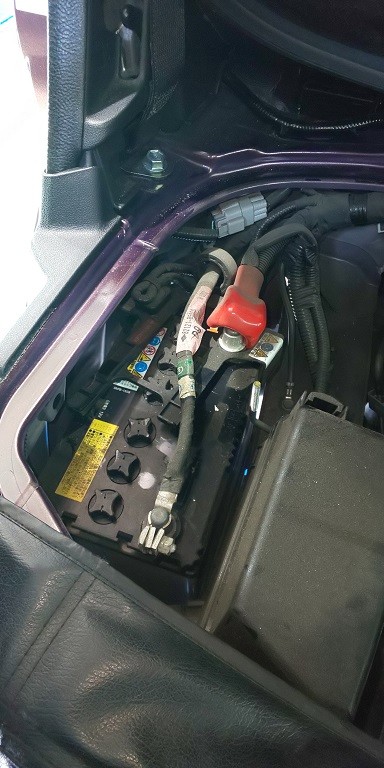 こちらの車種はボンネット内ではなく、運転席下を開けると写真のようにバッテリーがついています。