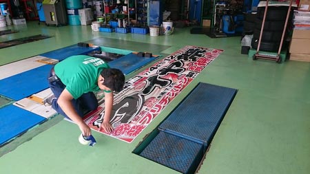 店舗正面上部のガラスに、タイヤ祭開催のお知らせを貼り出しています!