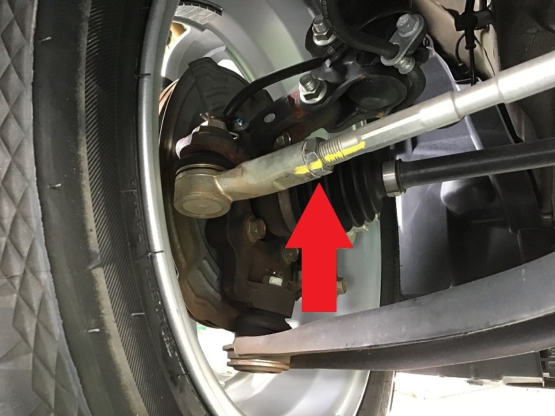 フロントはタイロッドエンドでの調整(矢印の場所)