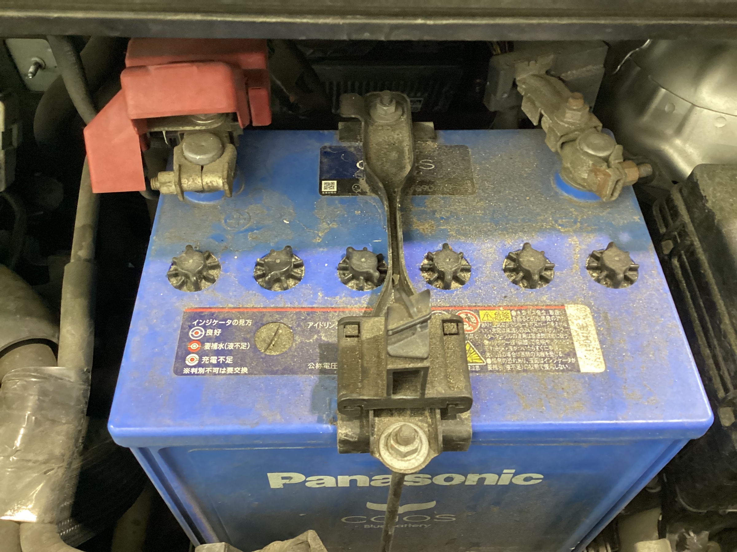 ボンネットを開けると写真のようにバッテリーがついています。