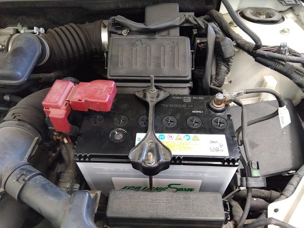 まず、ボンネットを開けると写真のようにバッテリーがついています。