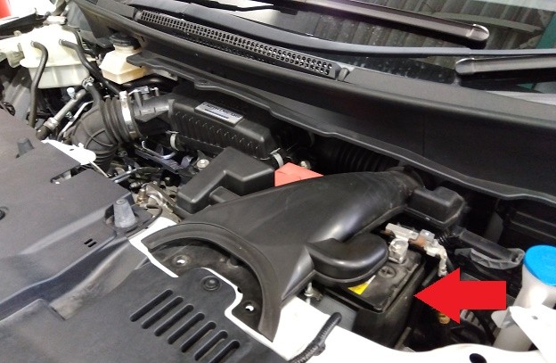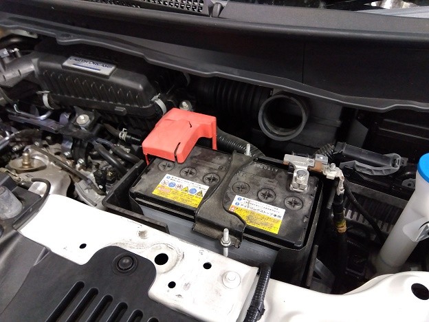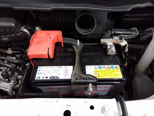 まず、ボンネットを開けると写真のようにバッテリーがついています。
