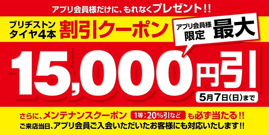 期間中、タイヤ館アプリをダウンロード頂くと、タイヤ購入時、最大15,000円引きクーポンをもれなくプレゼント!
